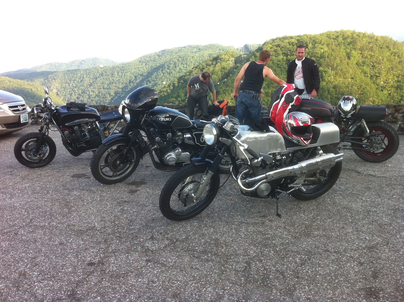 I got tired of waiting around and rode down the road for about 10 miles where I finally got cell phone reception and made some calls to let people know I was still alive. When I got back, ChimeraMW and his brother Jason had shown up. After BSing for awhile, we decided to take a ride back across The Dragon. We made it up to the scenic overlook and stopped to take a break.